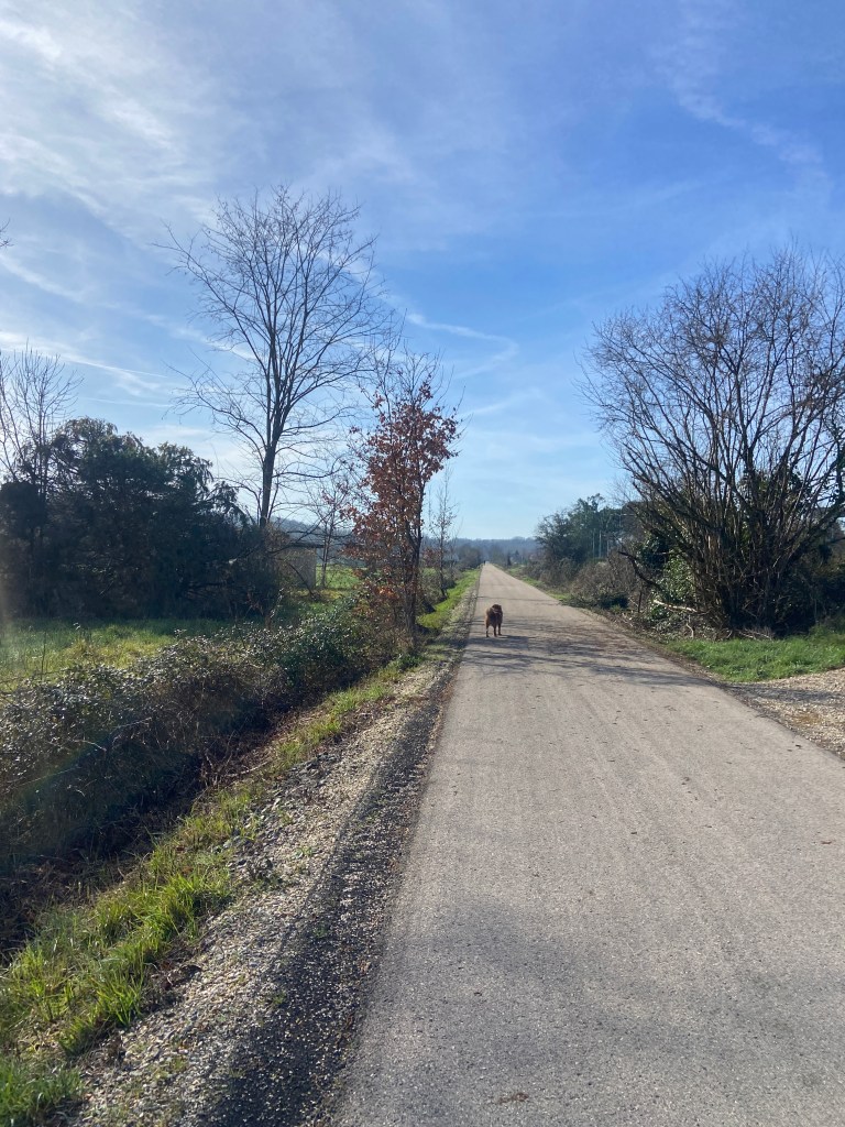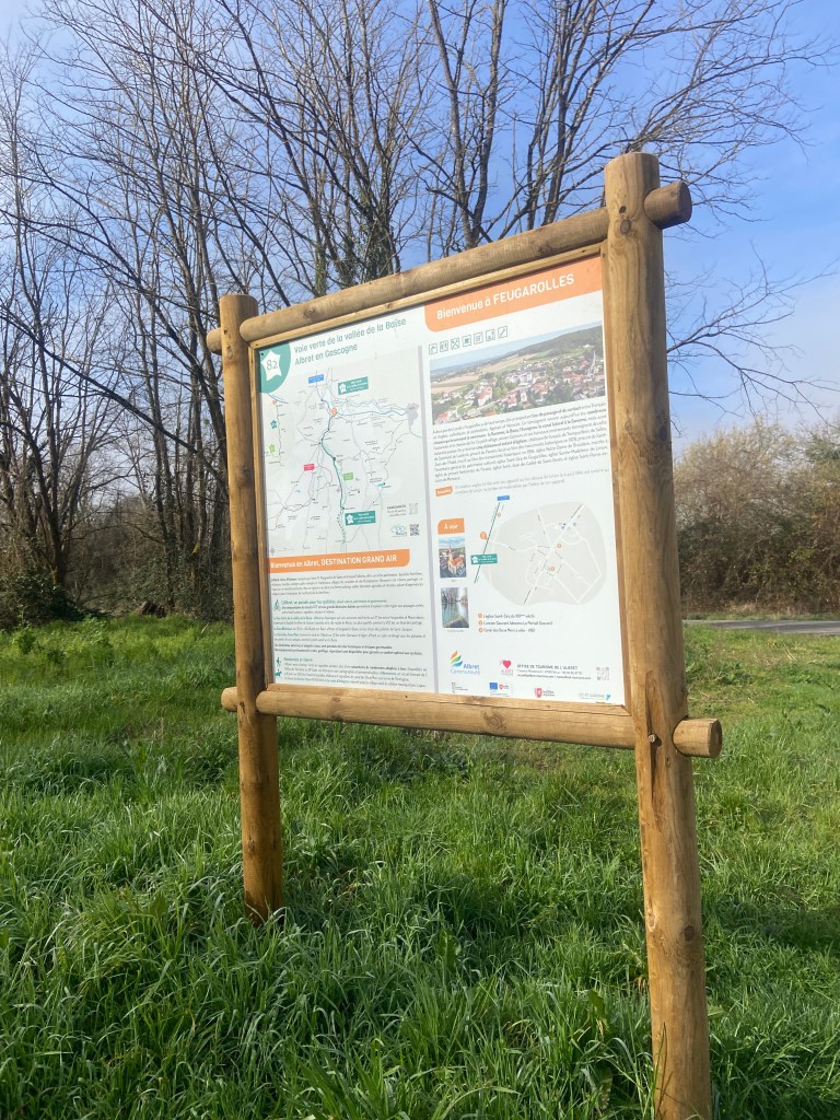 The voie verte runs from Feugarolles in the south to Moncrabeau in the north, with Nérac roughly in the middle. You can join it at several points along the way. There’s good parking in front of Vianne’s walls. The path is flat and paved throughout — fine for road bikes, hybrid bikes, or just walking.